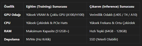 Eğitim = çoklu GPU + yüksek VRAM, Inference = verimlilik + düşük gecikme